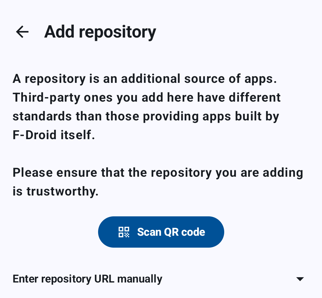 You can add the repository by QR (below) or by inputting the URL: https://app.futo.org/fdroid/repo.